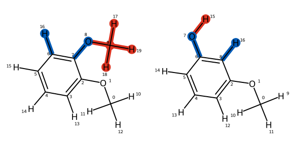 In an interactive notebook we can view a 2D representation of the mapping. In this view, atoms that are deleted are coloured red, while atoms that undergo an elemental transformation are coloured blue. Similarly, bonds that are deleted are coloured red, while bonds that change (either bond order change or element change), are coloured blue.